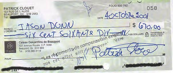 Thibodeau at 1-450-348-1519. SEPT 17, 2002 UPDATE: Believe it or not, I still haven't given up on getting my money back. I've heard from a fellow in Quebec who actually worked with Patrick Clouet at one point. He says that Patrick was fired for defrauding the company of $20,000. If Patrick is capable of that level of fraud, I'm not sure I'll ever see my money, but I received a tip from someone on a collections agency in Quebec. They are called Oligny & Thibodeau, and while their cut of 25% is a little steep, I only pay if they are successful. I figured I have nothing to lose, so now Patrick has a collections agency on his case - I truly hope they make life difficult for him. MAR 5, 2002 UPDATE: I'm getting a lot of email about this site from visitors, so I thought I'd answer a few of the questions I keep getting: "Why don't you go see Patrick in Quebec and get your money back?" Quebec is on the other side of Canada, roughly 2000 miles away from me - I'd spend more on a plane ticket than he owes me. "Why don't you contact Canada Post - isn't it mail fraud?" I tried that, but Canada post says it's not mail fraud - and I could find no one at the post office able to even give me a description of what would QUALIFY as mail fraud.